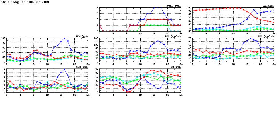 | Air Quality Data Time Series in Kwun Tong (2018/11/09) | ( Line colors: Day -3 Day -2 Day -1 Current day ) | 2D Map Current AQHI |