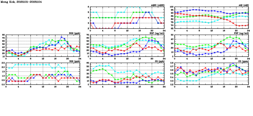 | Air Quality Data Time Series in Mong Kok (2018/11/04) | ( Line colors: Day -3 Day -2 Day -1 Current day ) | 2D Map Current AQHI |