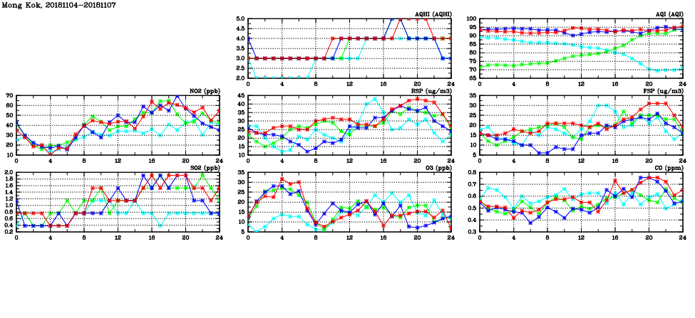 | Air Quality Data Time Series in Mong Kok (2018/11/07) | ( Line colors: Day -3 Day -2 Day -1 Current day ) | 2D Map Current AQHI |
