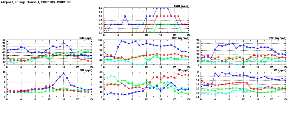 | Air Quality Data Time Series in Airport, Pump House 1 (2018/11/09) | ( Line colors: Day -3 Day -2 Day -1 Current day ) | 2D Map Current AQHI |