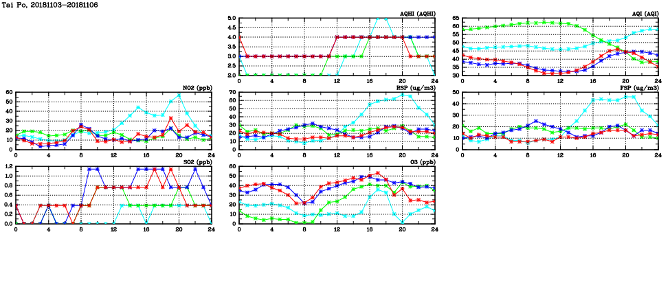 | Air Quality Data Time Series in Tai Po (2018/11/06) | ( Line colors: Day -3 Day -2 Day -1 Current day ) | 2D Map Current AQHI |