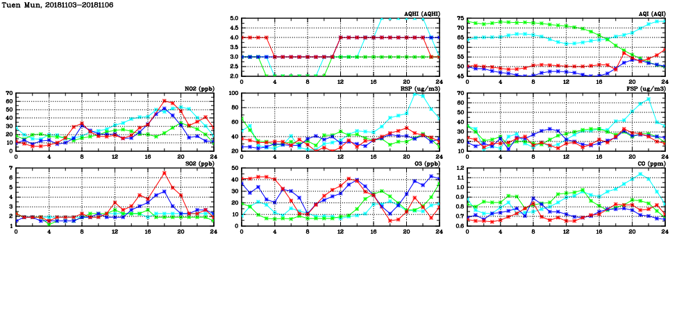 | Air Quality Data Time Series in Tuen Mun (2018/11/06) | ( Line colors: Day -3 Day -2 Day -1 Current day ) | 2D Map Current AQHI |