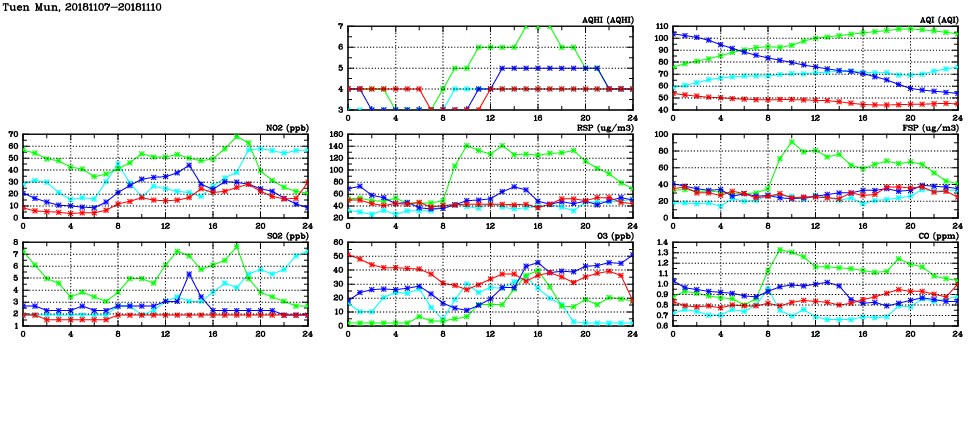 | Air Quality Data Time Series in Tuen Mun (2018/11/10) | ( Line colors: Day -3 Day -2 Day -1 Current day ) | 2D Map Current AQHI |