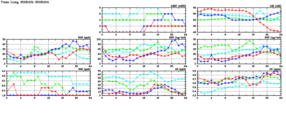 | Air Quality Data Time Series in Yuen Long (2018/11/04) | ( Line colors: Day -3 Day -2 Day -1 Current day ) | 2D Map Current AQHI |