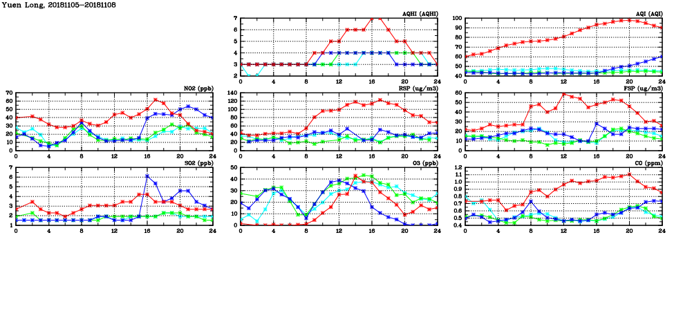 | Air Quality Data Time Series in Yuen Long (2018/11/08) | ( Line colors: Day -3 Day -2 Day -1 Current day ) | 2D Map Current AQHI |