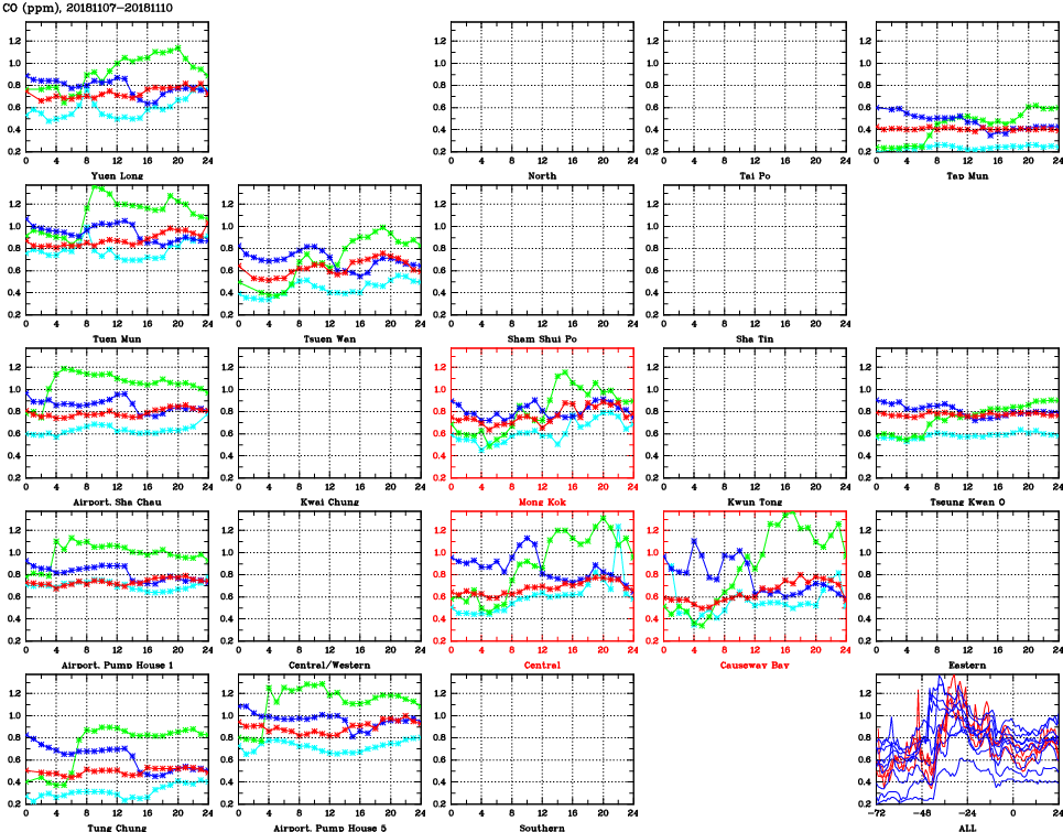 | Air Quality Data Time Series for CO (2018/11/10) | ( Line colors: Day -3 Day -2 Day -1 Current day ) | 2D Map Current AQHI |