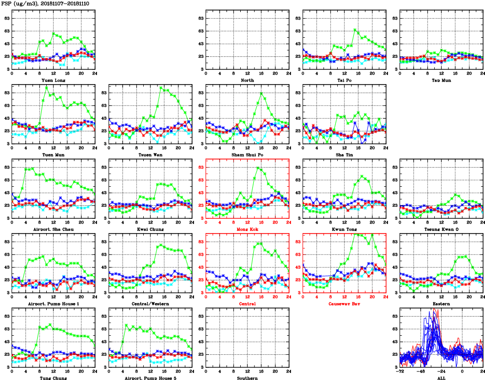 | Air Quality Data Time Series for FSP (2018/11/10) | ( Line colors: Day -3 Day -2 Day -1 Current day ) | 2D Map Current AQHI |