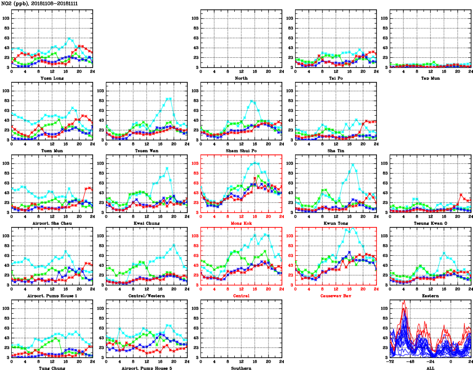 | Air Quality Data Time Series for NO2 (2018/11/11) | ( Line colors: Day -3 Day -2 Day -1 Current day ) | 2D Map Current AQHI |