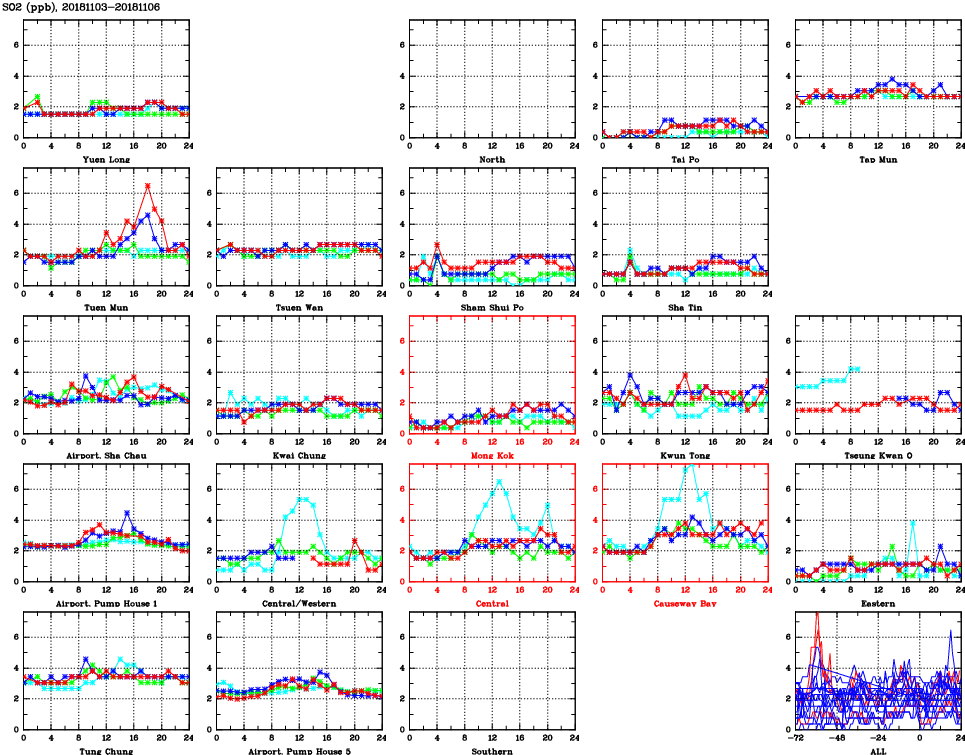 | Air Quality Data Time Series for SO2 (2018/11/06) | ( Line colors: Day -3 Day -2 Day -1 Current day ) | 2D Map Current AQHI |