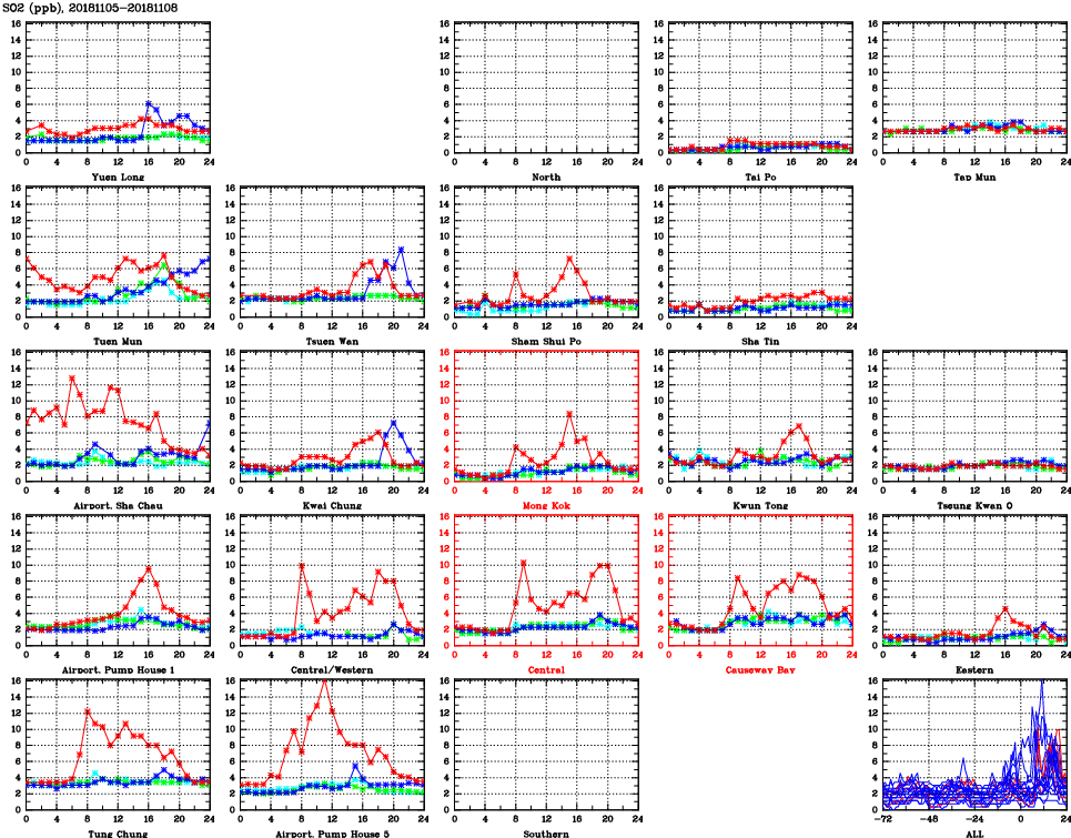 | Air Quality Data Time Series for SO2 (2018/11/08) | ( Line colors: Day -3 Day -2 Day -1 Current day ) | 2D Map Current AQHI |