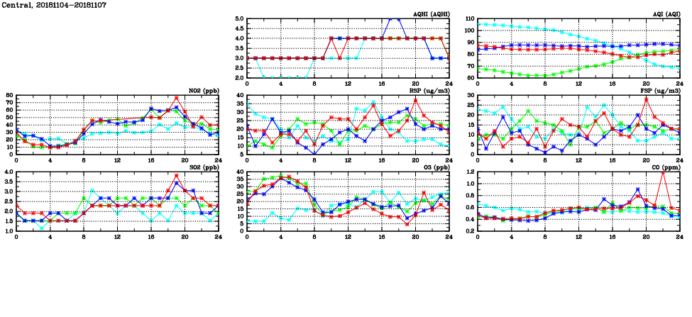 | Air Quality Data Time Series in Central (2018/11/07) | ( Line colors: Day -3 Day -2 Day -1 Current day ) | 2D Map Current AQHI |