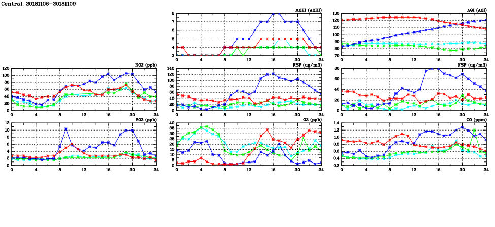| Air Quality Data Time Series in Central (2018/11/09) | ( Line colors: Day -3 Day -2 Day -1 Current day ) | 2D Map Current AQHI |