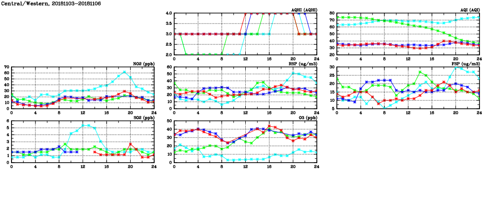 | Air Quality Data Time Series in Central/Western (2018/11/06) | ( Line colors: Day -3 Day -2 Day -1 Current day ) | 2D Map Current AQHI |