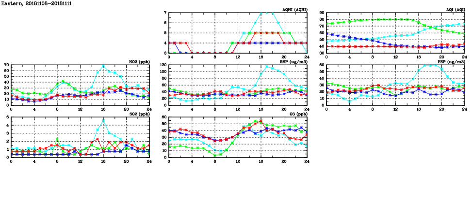 | Air Quality Data Time Series in Eastern (2018/11/11) | ( Line colors: Day -3 Day -2 Day -1 Current day ) | 2D Map Current AQHI |