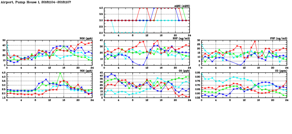 | Air Quality Data Time Series in Airport, Pump House 1 (2018/11/07) | ( Line colors: Day -3 Day -2 Day -1 Current day ) | 2D Map Current AQHI |