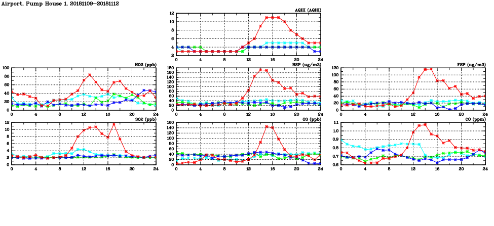 | Air Quality Data Time Series in Airport, Pump House 1 (2018/11/12) | ( Line colors: Day -3 Day -2 Day -1 Current day ) | 2D Map Current AQHI |