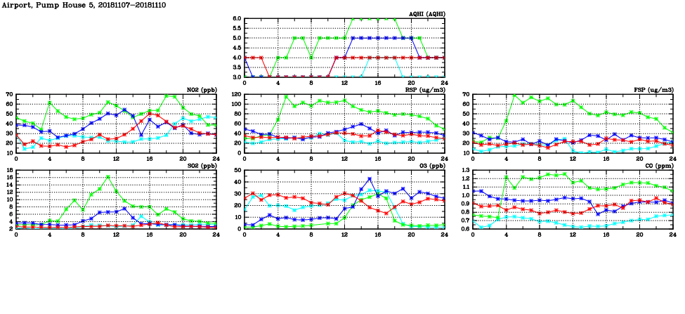 | Air Quality Data Time Series in Airport, Pump House 5 (2018/11/10) | ( Line colors: Day -3 Day -2 Day -1 Current day ) | 2D Map Current AQHI |