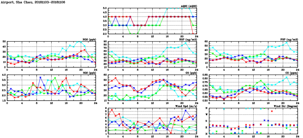 | Air Quality Data Time Series in Airport, Sha Chau (2018/11/06) | ( Line colors: Day -3 Day -2 Day -1 Current day ) | 2D Map Current AQHI |