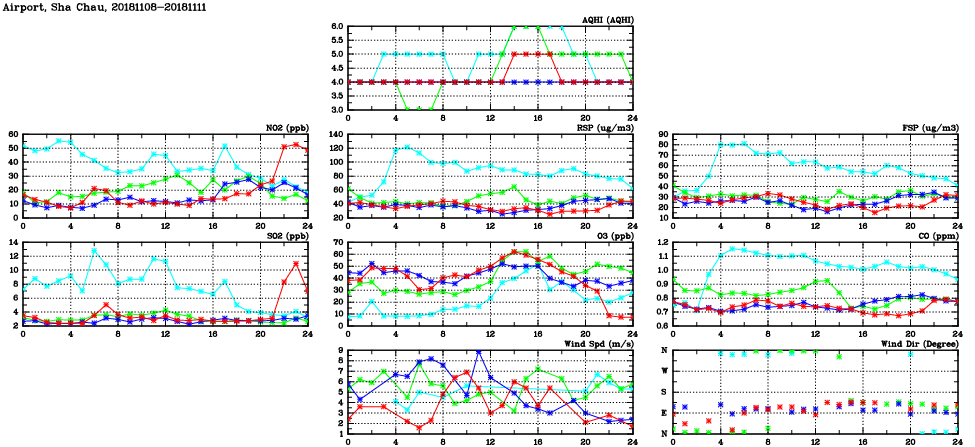 | Air Quality Data Time Series in Airport, Sha Chau (2018/11/11) | ( Line colors: Day -3 Day -2 Day -1 Current day ) | 2D Map Current AQHI |