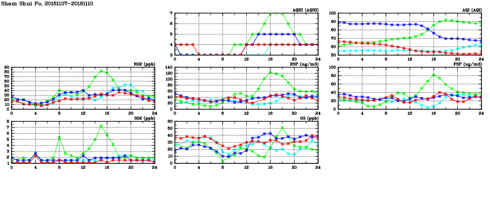 | Air Quality Data Time Series in Sham Shui Po (2018/11/10) | ( Line colors: Day -3 Day -2 Day -1 Current day ) | 2D Map Current AQHI |