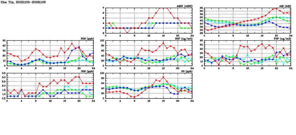 | Air Quality Data Time Series in Sha Tin (2018/11/08) | ( Line colors: Day -3 Day -2 Day -1 Current day ) | 2D Map Current AQHI |