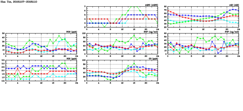 | Air Quality Data Time Series in Sha Tin (2018/11/10) | ( Line colors: Day -3 Day -2 Day -1 Current day ) | 2D Map Current AQHI |