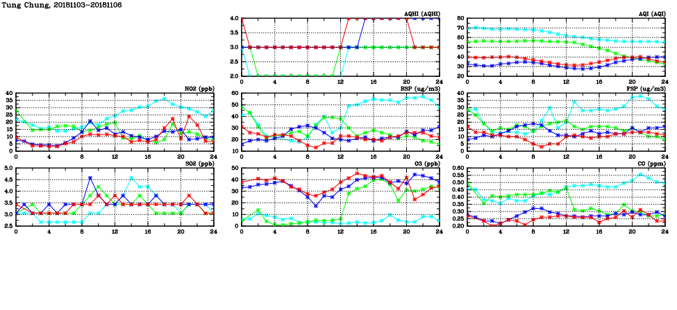 | Air Quality Data Time Series in Tung Chung (2018/11/06) | ( Line colors: Day -3 Day -2 Day -1 Current day ) | 2D Map Current AQHI |