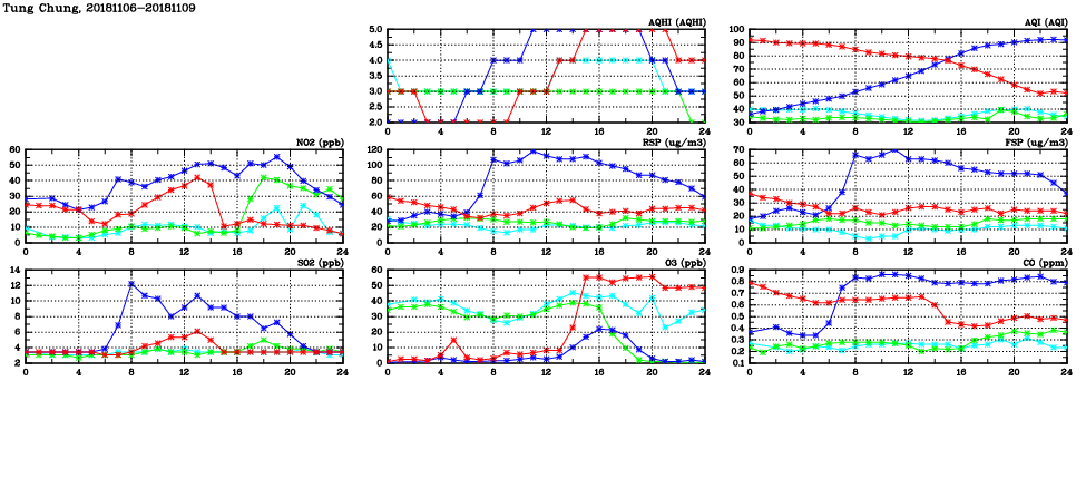 | Air Quality Data Time Series in Tung Chung (2018/11/09) | ( Line colors: Day -3 Day -2 Day -1 Current day ) | 2D Map Current AQHI |