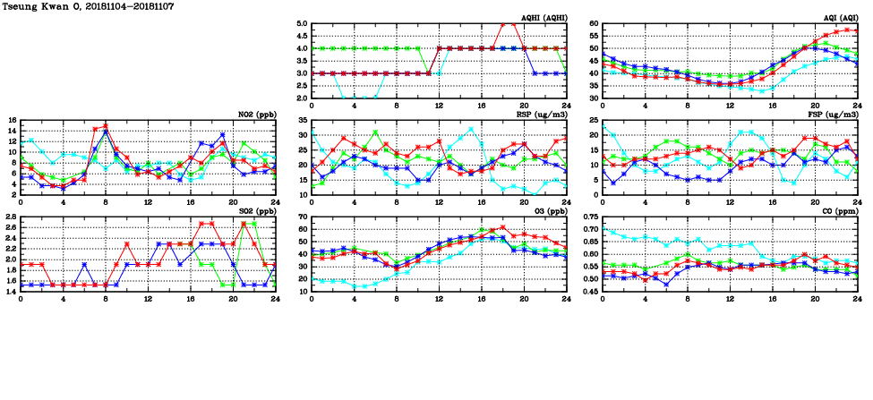 | Air Quality Data Time Series in Tseung Kwan O (2018/11/07) | ( Line colors: Day -3 Day -2 Day -1 Current day ) | 2D Map Current AQHI |