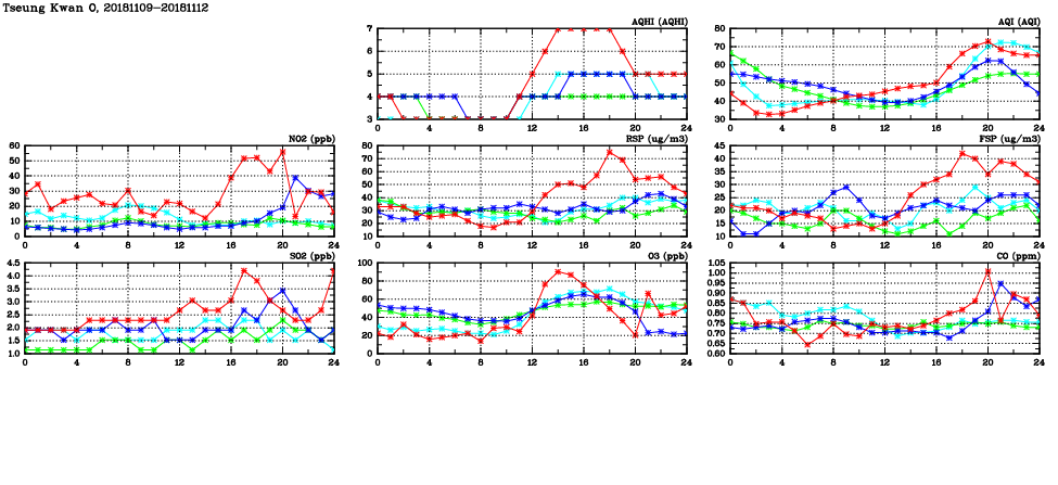 | Air Quality Data Time Series in Tseung Kwan O (2018/11/12) | ( Line colors: Day -3 Day -2 Day -1 Current day ) | 2D Map Current AQHI |