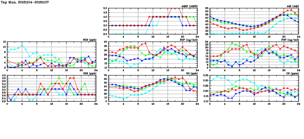 | Air Quality Data Time Series in Tap Mun (2018/11/07) | ( Line colors: Day -3 Day -2 Day -1 Current day ) | 2D Map Current AQHI |