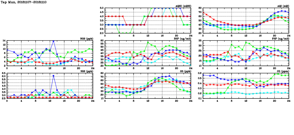 | Air Quality Data Time Series in Tap Mun (2018/11/10) | ( Line colors: Day -3 Day -2 Day -1 Current day ) | 2D Map Current AQHI |