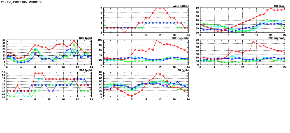 | Air Quality Data Time Series in Tai Po (2018/11/08) | ( Line colors: Day -3 Day -2 Day -1 Current day ) | 2D Map Current AQHI |
