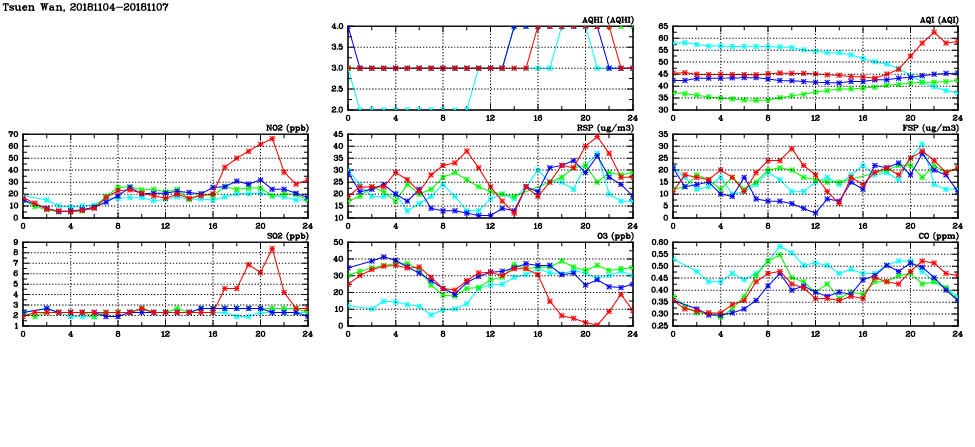 | Air Quality Data Time Series in Tsuen Wan (2018/11/07) | ( Line colors: Day -3 Day -2 Day -1 Current day ) | 2D Map Current AQHI |