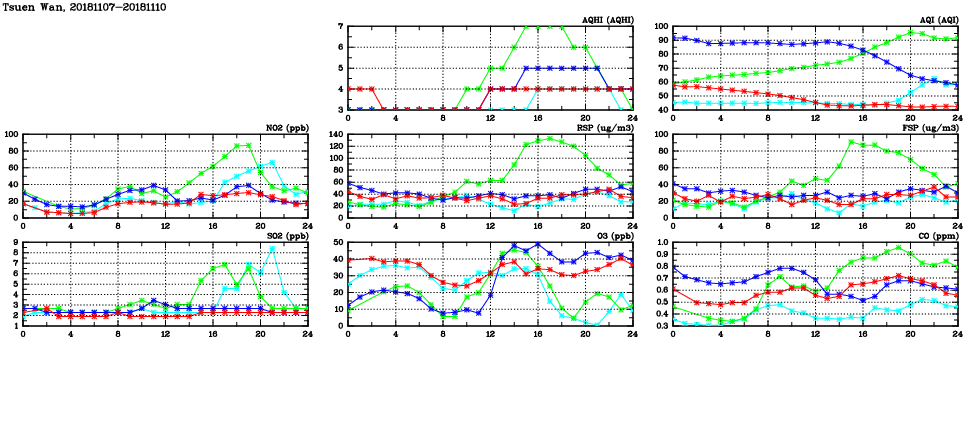 | Air Quality Data Time Series in Tsuen Wan (2018/11/10) | ( Line colors: Day -3 Day -2 Day -1 Current day ) | 2D Map Current AQHI |