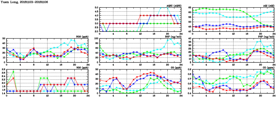 | Air Quality Data Time Series in Yuen Long (2018/11/06) | ( Line colors: Day -3 Day -2 Day -1 Current day ) | 2D Map Current AQHI |