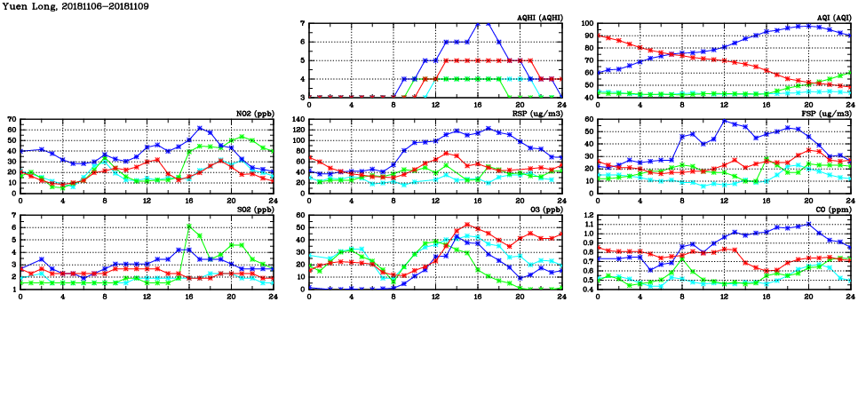 | Air Quality Data Time Series in Yuen Long (2018/11/09) | ( Line colors: Day -3 Day -2 Day -1 Current day ) | 2D Map Current AQHI |