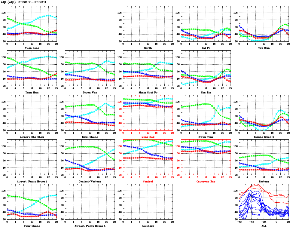 | Air Quality Data Time Series for AQI (2018/11/11) | ( Line colors: Day -3 Day -2 Day -1 Current day ) | 2D Map Current AQHI |