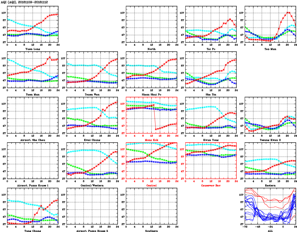 | Air Quality Data Time Series for AQI (2018/11/12) | ( Line colors: Day -3 Day -2 Day -1 Current day ) | 2D Map Current AQHI |