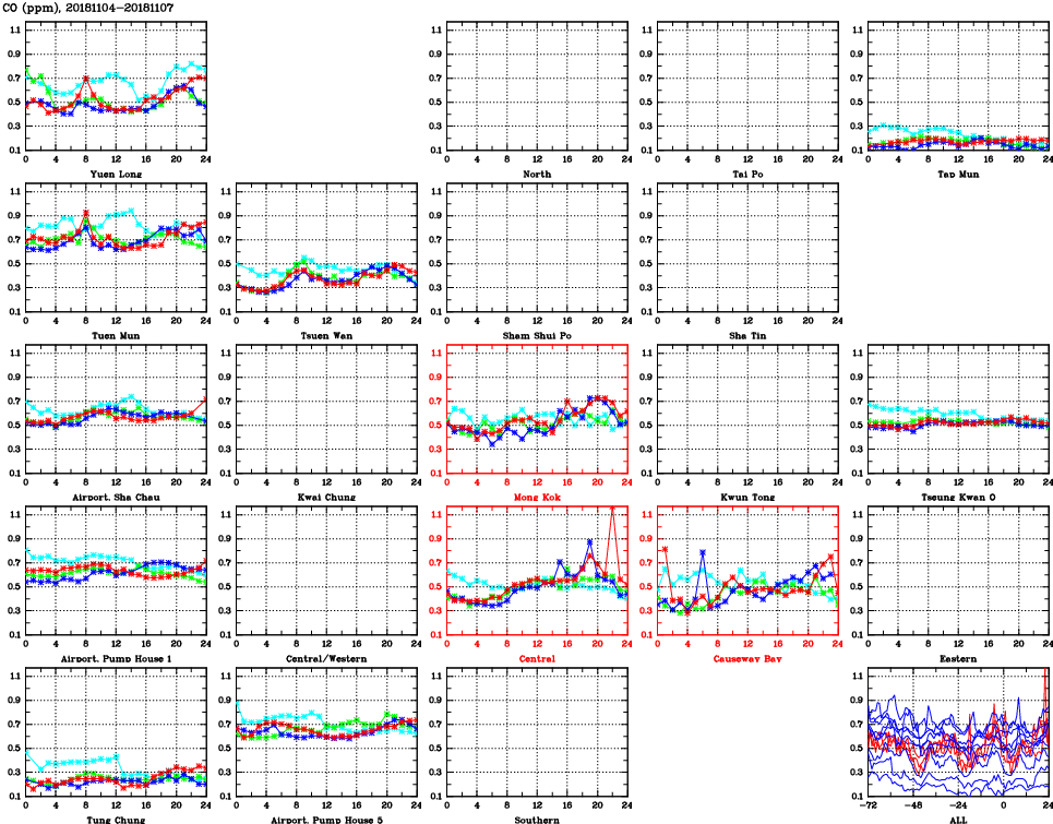 | Air Quality Data Time Series for CO (2018/11/07) | ( Line colors: Day -3 Day -2 Day -1 Current day ) | 2D Map Current AQHI |