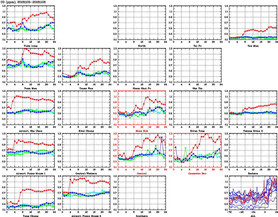 | Air Quality Data Time Series for CO (2018/11/08) | ( Line colors: Day -3 Day -2 Day -1 Current day ) | 2D Map Current AQHI |