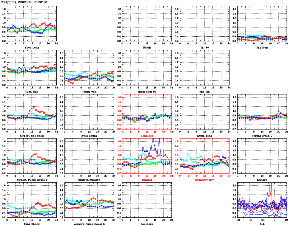 | Air Quality Data Time Series for CO (2018/11/12) | ( Line colors: Day -3 Day -2 Day -1 Current day ) | 2D Map Current AQHI |