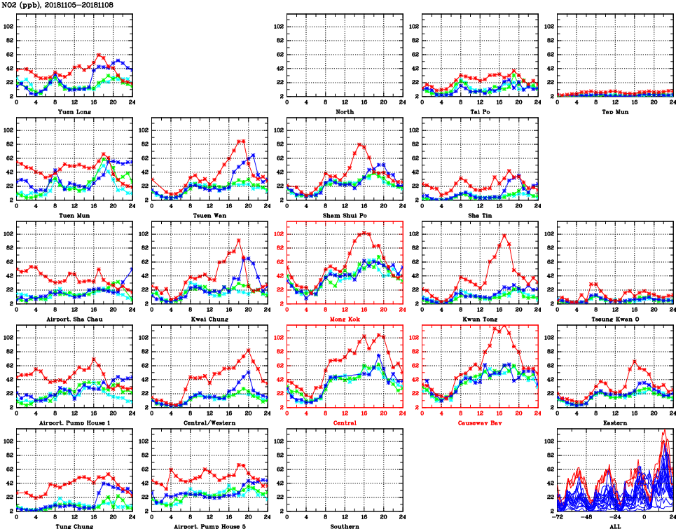 | Air Quality Data Time Series for NO2 (2018/11/08) | ( Line colors: Day -3 Day -2 Day -1 Current day ) | 2D Map Current AQHI |
