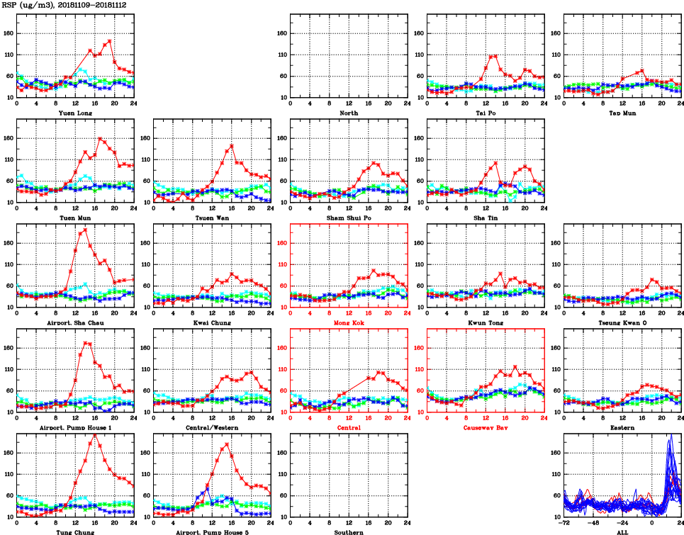 | Air Quality Data Time Series for RSP (2018/11/12) | ( Line colors: Day -3 Day -2 Day -1 Current day ) | 2D Map Current AQHI |