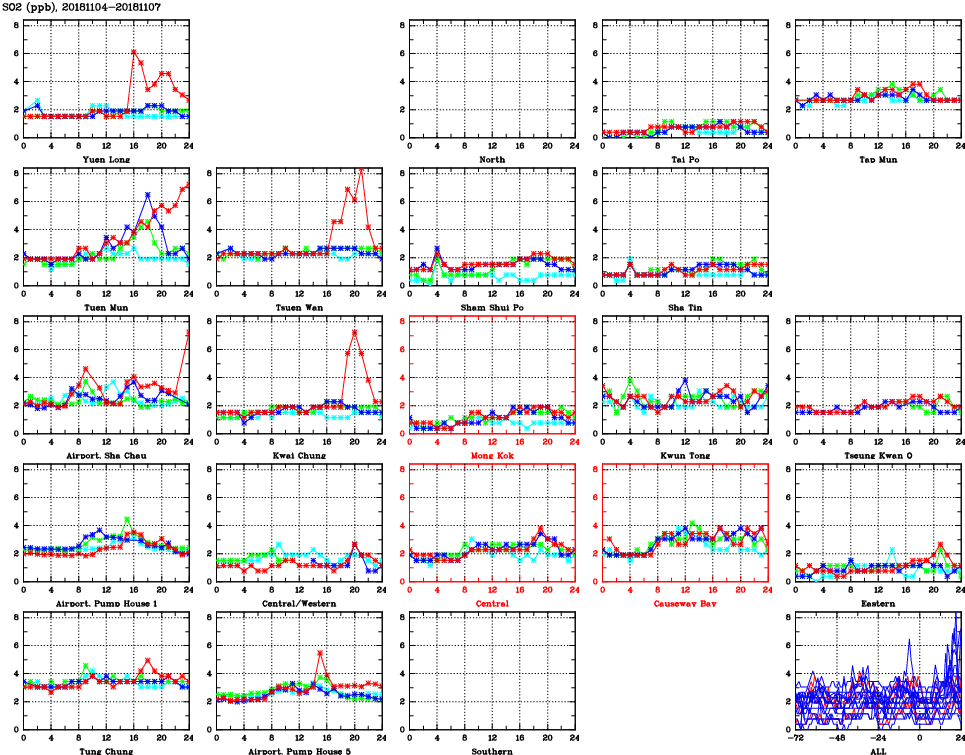 | Air Quality Data Time Series for SO2 (2018/11/07) | ( Line colors: Day -3 Day -2 Day -1 Current day ) | 2D Map Current AQHI |