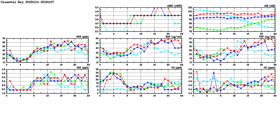 | Air Quality Data Time Series in Causeway Bay (2018/11/07) | ( Line colors: Day -3 Day -2 Day -1 Current day ) | 2D Map Current AQHI |
