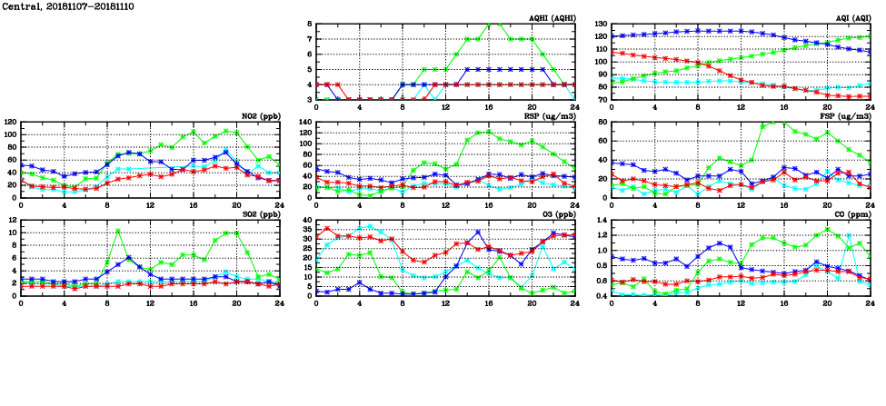 | Air Quality Data Time Series in Central (2018/11/10) | ( Line colors: Day -3 Day -2 Day -1 Current day ) | 2D Map Current AQHI |