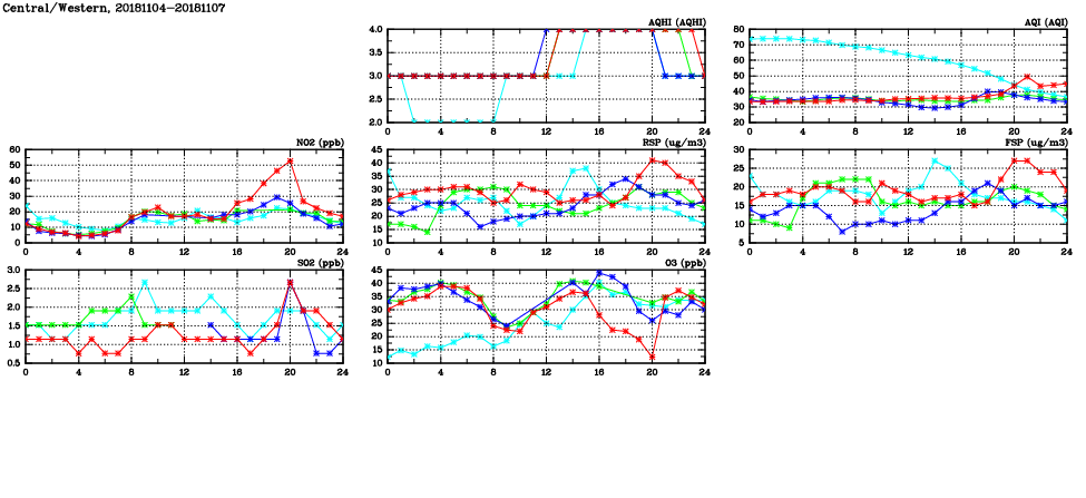 | Air Quality Data Time Series in Central/Western (2018/11/07) | ( Line colors: Day -3 Day -2 Day -1 Current day ) | 2D Map Current AQHI |