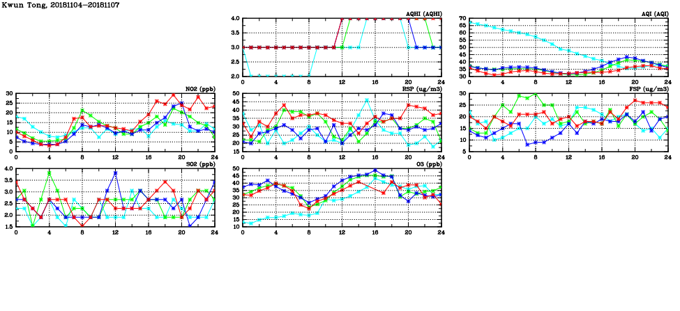 | Air Quality Data Time Series in Kwun Tong (2018/11/07) | ( Line colors: Day -3 Day -2 Day -1 Current day ) | 2D Map Current AQHI |