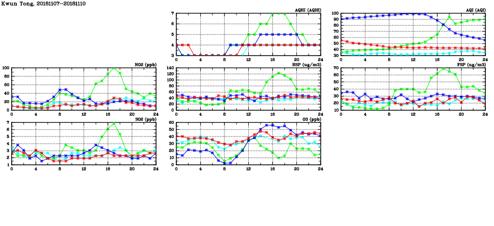 | Air Quality Data Time Series in Kwun Tong (2018/11/10) | ( Line colors: Day -3 Day -2 Day -1 Current day ) | 2D Map Current AQHI |